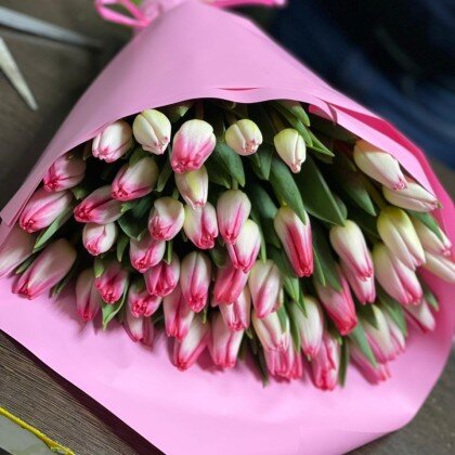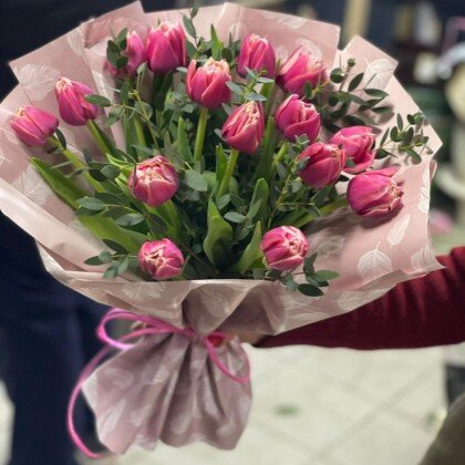 Букет пионовидных тюльпанов с эвкалиптом 15