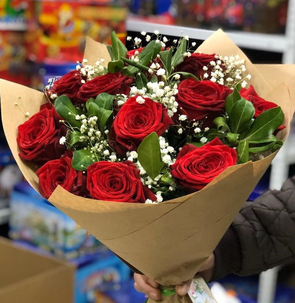 Бордовая роза - 11 шт Гипсофила - 1 шт Рускус - 7 шт Крафт бумага - 1 шт Высота 50см Ширина 35 см