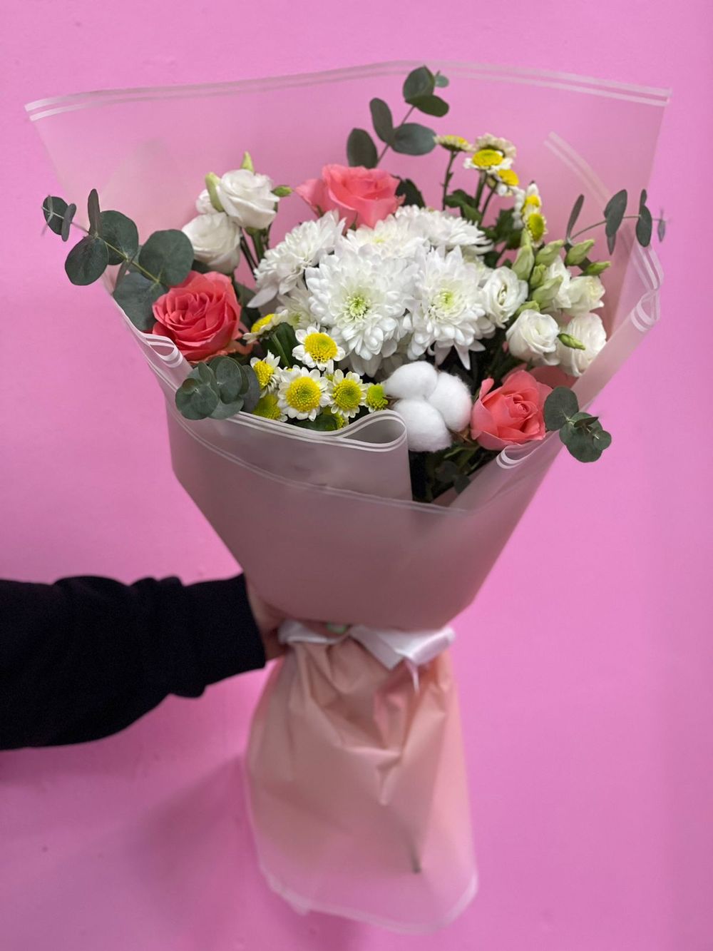 Роза розовая - 3 шт Хризантема кустовая - 1 шт Эустома - 2 шт Сантини - 2 шт Хлопок - 1 шт Эвкалипт - 3 шт Корейская пленка - 1 шт Высота 60см Ширина 30 см