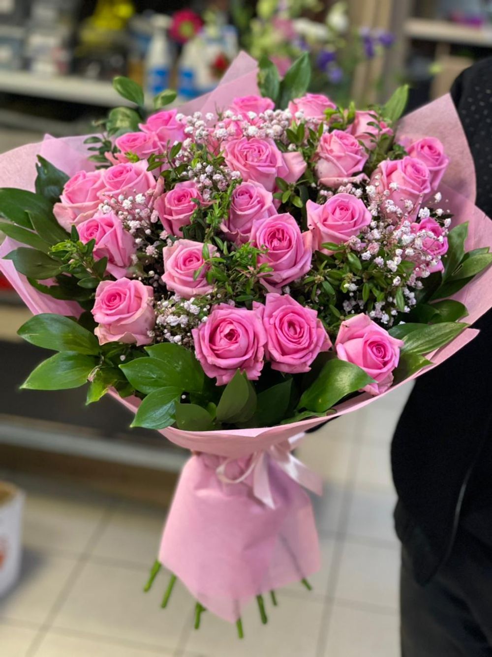 Розовая роза - 25 шт Гипсофила - 3 шт Писташ- 5 шт Рускус Корейская пленка - 1 шт Высота 50см Ширина 40 см