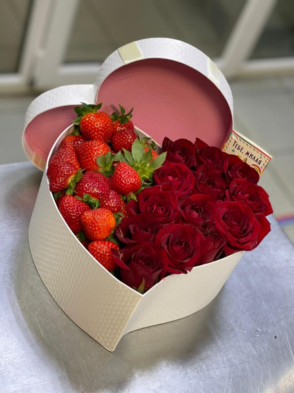 Бордовая роза - 11 шт Клубника Коробка сердцем Высота 15см Ширина 20 см