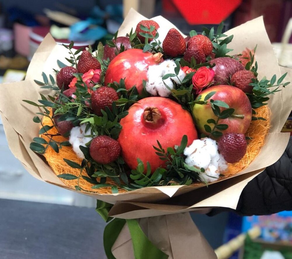 Гранат - 2 Яблоко - 5 Клубника - 300 гр Хлопок - 3 Роза кустовая - 5 Писташ - 3 шт Крафт бумага - 1 Высота 40см Ширина 40 см