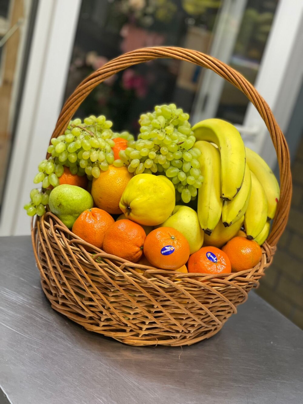Виноград - 1 кг Банан - 1 кг Мандарины - 1 кг Апельсины - 2 кг Груша - 1 кг Яблоко - 1 кг Корзина - 1 шт Высота 40см Ширина 40 см