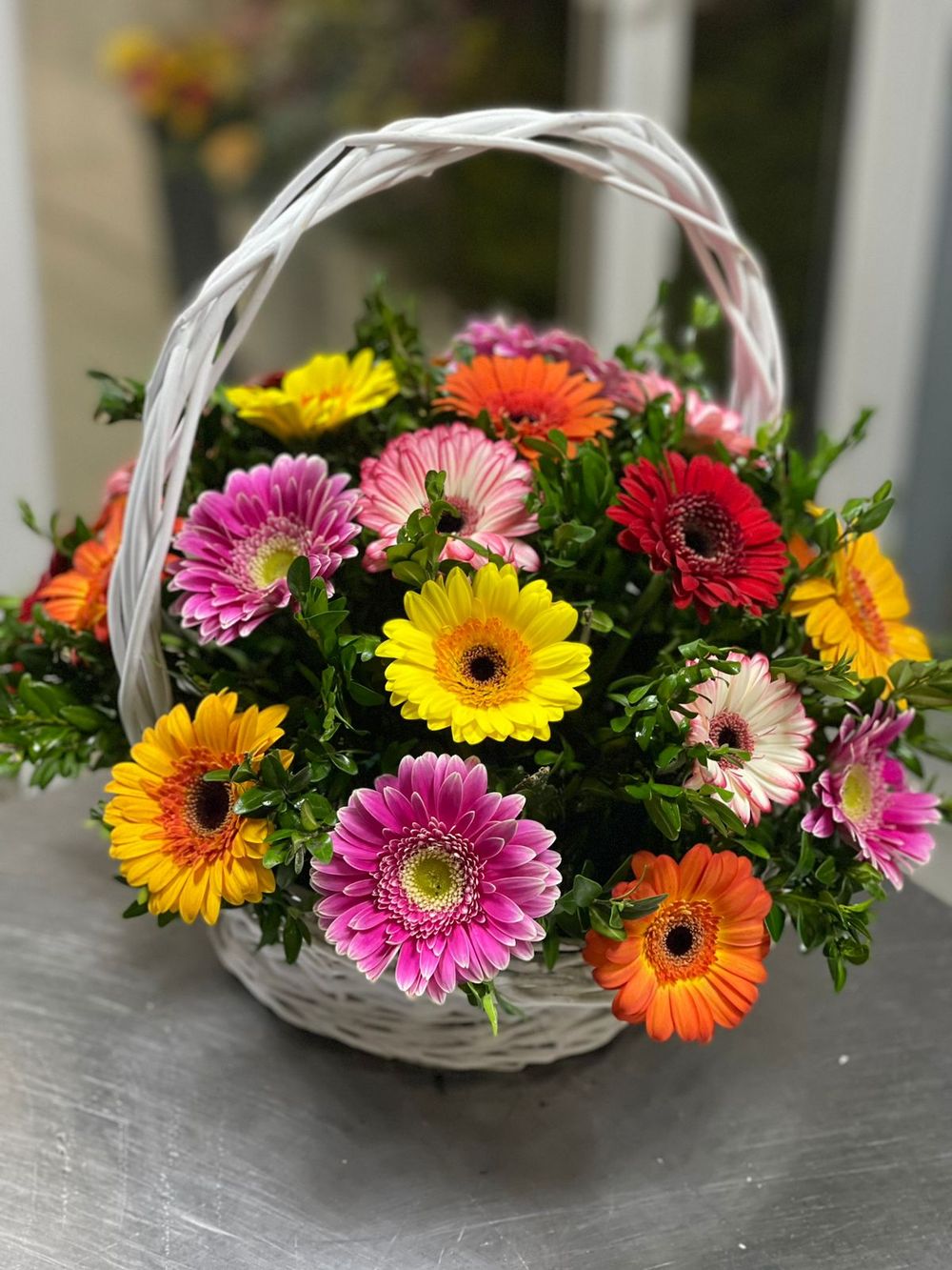 Гербера - 25 шт Писташ пучок Корзина - 1 шт Атласная лента - 1 шт Высота 30см Ширина 30 см