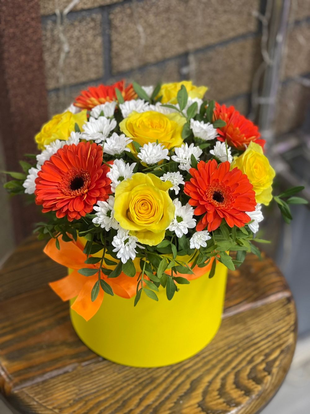 Желтая роза - 5 шт Гербера - 4 шт Хризантема кустовая - 4 шт Писташ - 2 шт Шляпная коробка - 1 шт Высота 25см Ширина 20 см