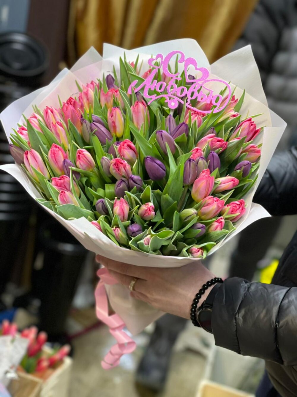 Тюльпаны микс - 101 шт Корейская упаковка - 1 шт Топпер «С любовью» - 1 шт Высота 40см Ширина 50 см